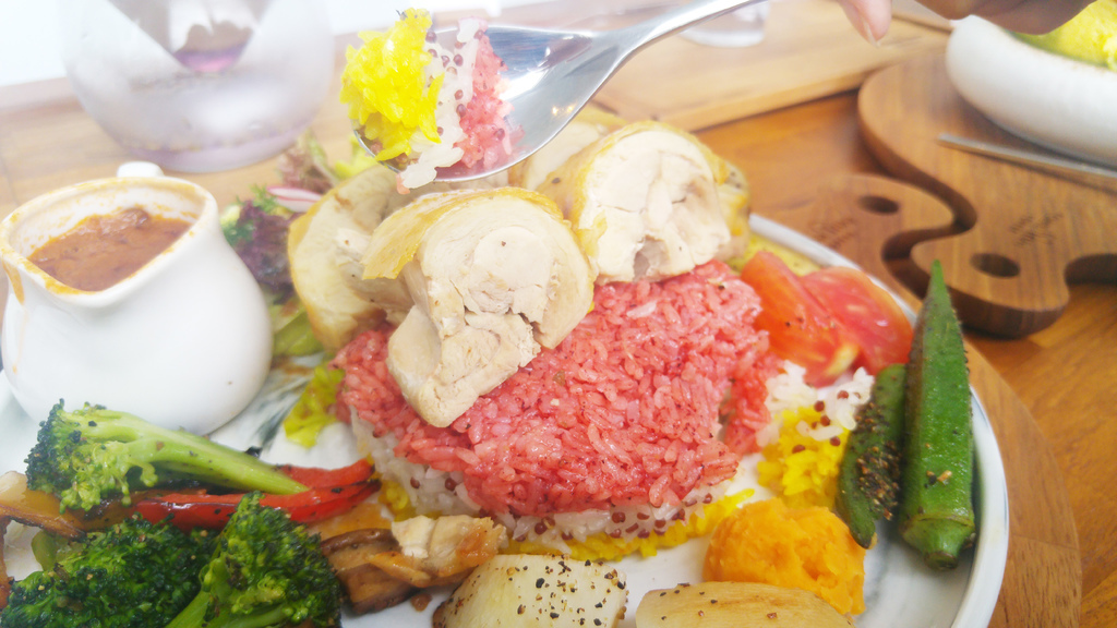 看米飯使用的食材,應該是天然色澤,感覺是紅藜飯、薑黃飯那類的