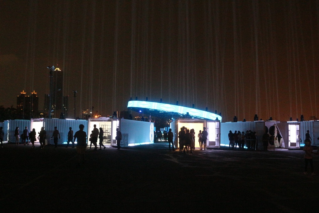 遠遠看就能看到22間貨櫃圍繞著設計中島,並搭配投射燈光