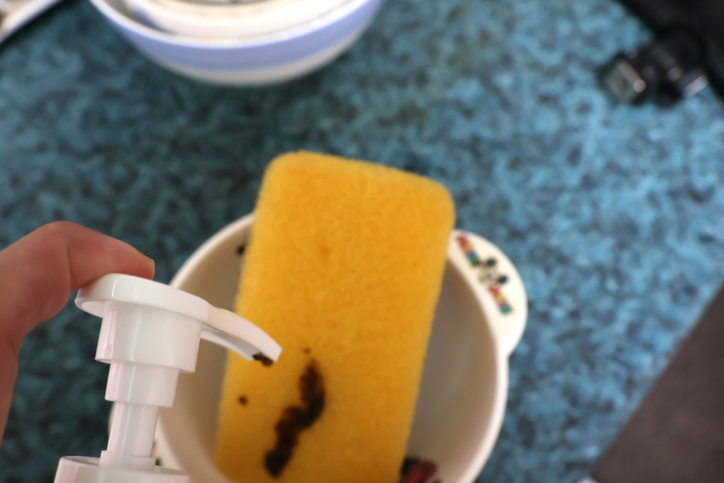 而且真的就像包裝說明一樣好沖洗、不咬手,平常裝黏膩食物的碗盤輕鬆刷幾下就能輕鬆去除,也相當好沖洗